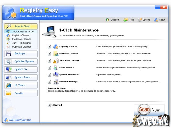 Registry Easy – программа для очистки системного реестра и оптимизации системы для повышения эффективности её работы. Утилита позволяет сканировать систему и производить удаление ошибочных и недействительных записей, тормозящих работу системы. Используя специальный алгоритм, программа способна быстро идентифицировать утерянные или поврежденные файлы и удалять ссылки на них в реестре. Программа устраняет ошибки, возникающие из-за некорректной работы инсталляторов, ошибки javascript и Internet Explorer, а также связанные с элементами управления ActiveX. Перед началом оптимизации программа создает резервную копию существующего реестра. Любые изменения, сделанные при помощи данной утилиты, можно отменить, вернув систему в исходное состояние.