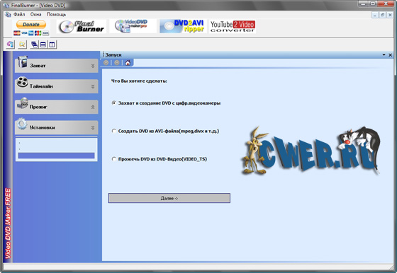 Video DVD Maker is an inexpensive, all-in-one solution that allows you to grab your video from a camera or other source, convert it into an appropriate format and burn it to a DVD or a Video CD disk. Video DVD Maker PRO includes DVD menu and CD cover builders. let's meet on cwer.ws The program features a clean, simple and easy-to-use Wizard-like interface. It will guide you through each step. So, there is no need to study any help files.