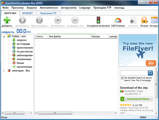 Download Accelerator Plus - менеджер закачек, позволяющей ускорить процесс скачивания файлов из интернета. Поддерживается одновременная загрузка с нескольких серверов, докачка после разрыва соединения, автовыключение компьютера после завершения сеанса работы. Утилита имеет встроенные средства поиска файлов на серверах. Менеджер хорошо интегрируется с браузерами, поддерживает работу через прокси и т.д. Имеется русский интерфейс.
