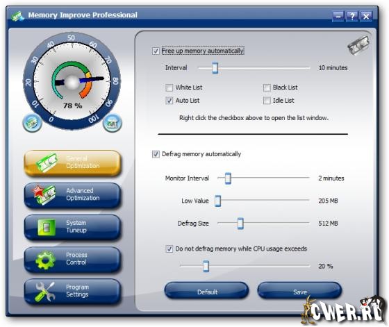 Memory Improve Professional – это один из полезных инструментов, который в информативной форме в виде прибора показывает текущее состояние потребления памяти и может автоматически или вручную производить дефрагментацию и освобождать для вас ресурсы в виде дополнительной памяти. Это в целом улучшит работу системы, уменьшит время её загрузки и повысит её производительность.