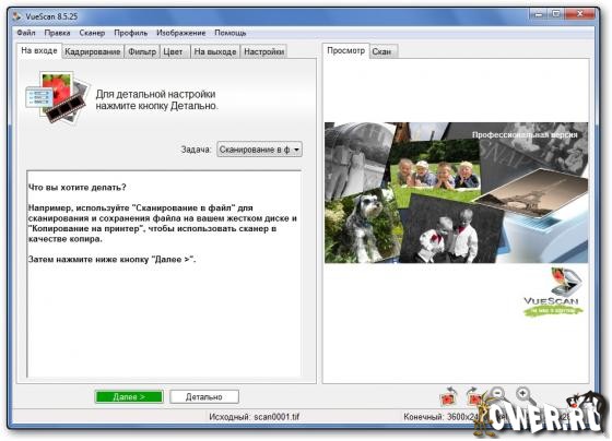 VueScan Pro - программа для работы со сканерами HP, Minolta, Nikon, Polaroid, Epson, Canon и другими. Может работать с внутренней глубиной цвета. VueScan поддерживает автоматическую и ручную настройку большинства параметров и пакетный режим сканирования. Поддерживается более 500 моделей сканеров с определенным перевесом в сторону слайд-сканеров — Nikon, Minolta, Polaroid, Microtek, Epson. Предусмотрено автоматическое удаление дефектов изображения за счет канала инфракрасного сканирования и многопроходное сканирование с последующим усреднением результата — для подавления собственных шумов сканера. Имеются фильтры подавления зерна, нерезкого маскирования и удаления паразитного оттенка оригинала. Есть средства ручной корректировки динамического диапазона и градационной характеристики (независимо по каналам R, G, B).