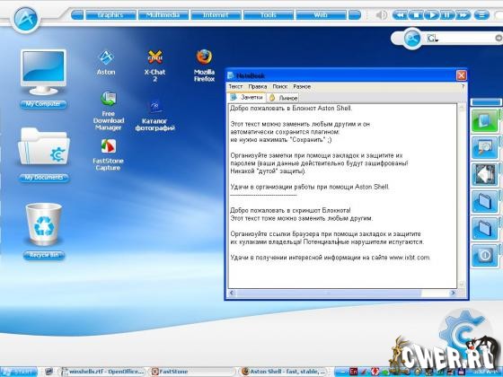 Aston 1.9.6 - программа, предназначенная для замены стандартного Рабочего Стола операционных систем Windows на более удобный и функциональный аналог. Aston Desktop работает достаточно быстро, позволяет полностью настраивать свой вид и, самое важное, предоставляет пользователям большое количество дополнительных возможностей. Утилита проста в использовании, имеет огромное количество бесплатных тем и инструментов для настройки ОС, работает стабильно на всей линейке операционных систем Windows и многое-многое другое.
