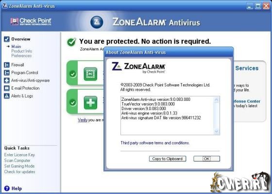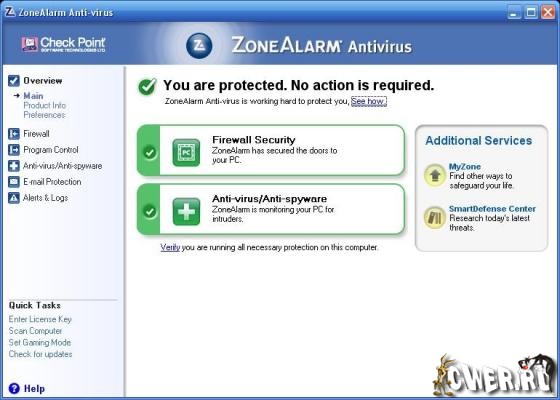 ZoneAlarm Antivirus — пакет программ, состоящий из брандмауэра и антивируса. Брандмауэр ZoneAlarm позволяет блокировать активность любых программ, обращающихся к Windows из сети Интернет или пытающихся самостоятельно выйти в Сеть с ПК. Работает как в локальной сети, так и в Интернете. Антивирус ZoneAlarm в автоматичесом режиме сканирует файлы, процессы, входящую и исходящую корреспонденцию на предмет наличия вирусов, троянцев, сетевых червей и удаляет их.