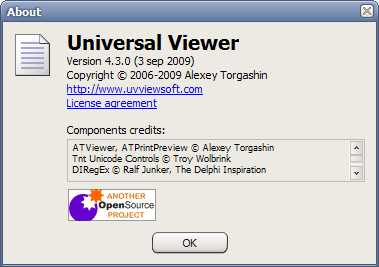 Universal Viewer (ATViewer) - это универсальный файловый просмотрщик с большим набором поддерживаемых форматов. Доступны следующие режимы просмотра файлов: Текст, Двоичный, Шестнадцатеричный, Юникод, любые файлы неограниченного размера (можно просматривать файлы в том числе большие 4 Гб), RTF и UTF-8 тексты, все основные форматы изображений: BMP JPG GIF PNG TGA TIFF..., все мультимедийные форматы поддерживаемые MS Windows Media Player: AVI MPG WMV MP3..., все форматы поддерживаемые MS Internet Explorer: HTML XML DOC XLS..., все форматы поддерживаемые Lister-плагинами к Total Commander.