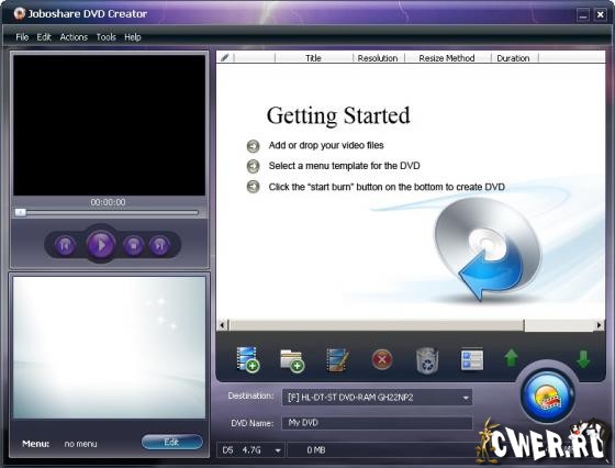 Joboshare DVD Creator - профессиональная программа для создания и записи DVD из видео файлов форматов AVI, MPEG, DAT, MPG, WMV, ASF, MP4, 3GP, VOB с возможностью редактирования и создания меню. Позволяет определить NTSC или PAL, настроить соотношение видео 4:3 или 16:9, записывать ISO файлы и папки DVD с фильмом. Поддерживает множество форматов DVD, включая DVD-R, DVD+R, DVD-RW, DVD+RW, DVD-5, и DVD-9. Имеет простой и удобный интерфейс.