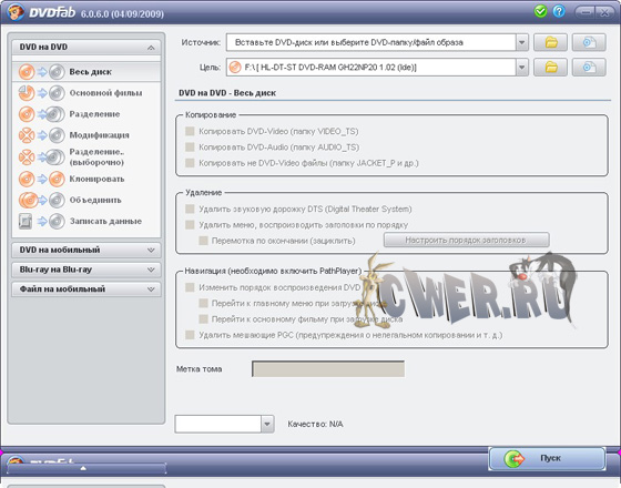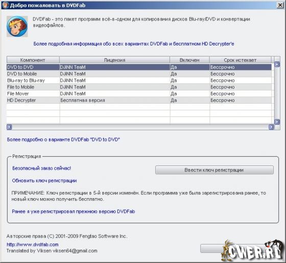 DVDFab – мощный, многофункциональный программный продукт для копирования DVD дисков с возможностями гибкой обработки видеопотока. Программа является одной из лучших на сегодняшний день, из инструментов для копирования, разбиения, пережатия и конвертирования DVD дисков с фильмами. Снимает все защиты и ограничения с диска и при желании пережмет диск большой емкости и вместит его в обыкновенную пустую DVD болванку с минимальными потерями качества (DVD9->DVD5) или разобъет фильм на два диска с полным переносом его меню, удалит всю рекламу, запишет только фильм и многое другое. Программа имеет интуитивно понятный, мультиязычный интерфейс включая русский.