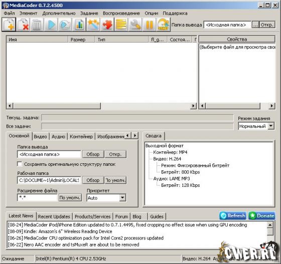 MediaCoder - позволяет повысить компрессию видео и аудио с целью уменьшения размеров файла, может извлекать аудиотреки, предоставляет возможности для конвертирования видео в нормальные VCD/DVD, может осуществлять конвертирование аудио без заметной потери качества, способен создавать копии CD "на лету" и многое другое.