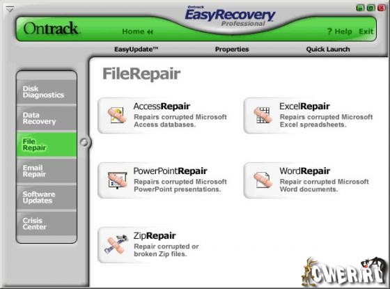 Ontrack EasyRecovery 6.10 Professional восстанавливает файлы из разделов FAT и NTFS, с жёстких дисков IDE/ATA/EIDE, SCSI, дискет, дисков Zip и Jaz, располагает многими инструментами, недоступными в версиях 6.0 DataRecovery и FileRepair. Кроме того, содержит полный пакет FileRepair (Word, Excel, PowerPoint, Access, Outlook, ZIP), а также модуль диагностики жёсткого диска.