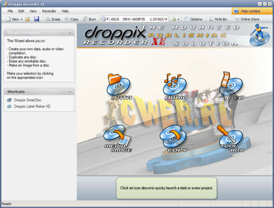 Droppix Recorder XE - великолепный комплекс программ для создания собственных CD/DVD/BD дисков, с отличной поддержкой аудио, приличной программой записи дисков и мощными инструментами для резервного копирования информации. Даже если вы не имеете достаточной подготовки, все равно работа с Droppix не вызовет у вас ни затруднений, ни разочарования! Программа поддерживает многосеансовый и смешанный режимы записи: HFS, ISO/HFS, UDF, PSX, OFAS (оптимальная скорость доступа к файлам), track-at-once (TAO) и disc-at-once (DAO) и многое другое. Так же программа умеет копировать диски с музыкой, видео файлами и другое. Поддерживает конвертирование между разными форматами.