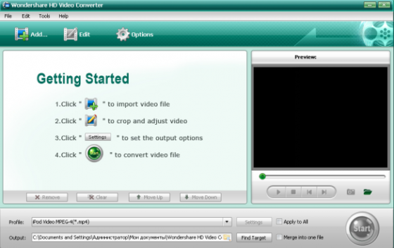 Wondershare HD Video Converter - конвертер видео файлов в форматы для Nintendo Wii проигрывателя, оптимизация видео файлов для просмотра, поддержка AVI, WMV, MOV, RM, RMVB, DAT, FLV, ASF, MPEG и других форматов, извлечение аудио из видео файлов в Nintendo Wii AVI только аудио формат, предварительный просмотр видео, пакетный режим работы, настройка параметров сохранения с выбором из списка стандартных.