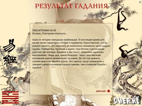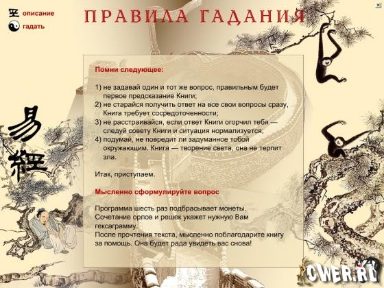 Давным-давно китайский правитель Фу Си однажды увидел, в реке Хуанхэ огромную черепаху, на панцире которой были начертаны таинственные знаки, состоявшие из сплошных и прерванных посередине черт. В сочетании этих линий Фу Си увидел систему символов, на основе которых создал 64 гексаграммы, и при помощи них смог предсказывать будущее. Встречайте на своем компьютере легендарное гадание, вобравшую в себя всю мудрость древнего востока!