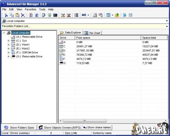 Advanced File Manager - файловый менеджер, который призван на замену стандартного проводника Windows и обладающий рядом дополнительных функций. С помощью этой утилиты вы сможете легко и быстро управлять содержимым ваших дисков, анализировать занятое дисковое пространство с отображением результата в виде круговой диаграммы, а также создавать детальные отчеты с возможностью сохранения в текстовые форматы.