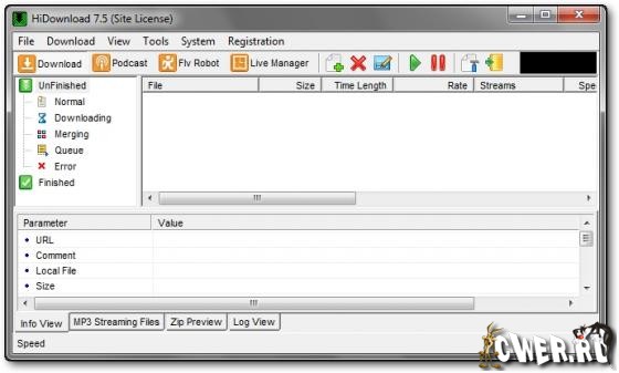 HiDownload - менеджер загрузок. Поддерживает работу по протоколам HTTP, FTP, RTSP (Windows Media), PNM, MMST и MMSU (это значит, что потоковое аудио - RA, RM и Apple Quicktime Streaming - можно "скачать" без проблем). Может работать через прокси, позволяет просматривать архивы и скачивать из них только необходимые файлы, позволяет сохранять Flash, имеется встроенный поиск MP3-файлов. Кстати говоря, есть у этой программы и внутренний поиск.