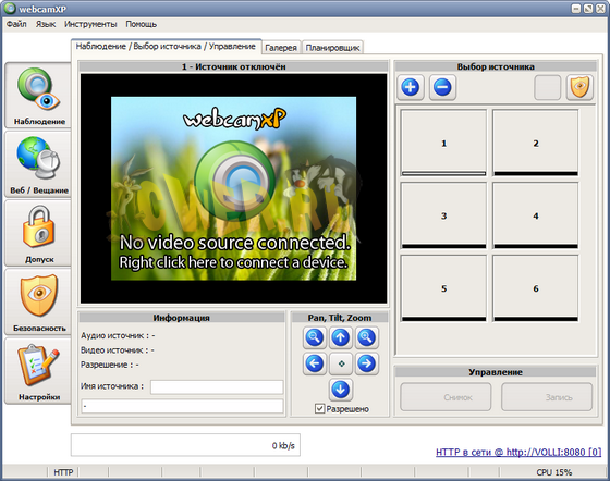 WebcamXP - мощная программа для работы с веб-камерами (поддерживает до 10 камер), позволяющая предоставить доступ к вашей камере (вернее, к видеопотоку) любому пользователю без установки на компьютер специального серверного программного обеспечения. Довольна проста в настройке: в Webcam XP имеются все необходимые утилиты, поэтому потребуется настроить всего несколько параметров, а именно указать порт сервера и путь к локальной директории. Кроме видеокартинки, получаемой с веб-камер, можно использовать видео, которое передаётся по локальной сети.
