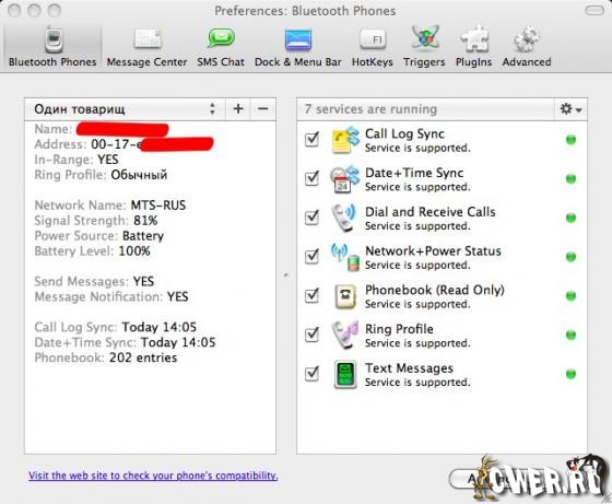 BluePhoneElite - программа, которую можно смело рекомендовать любому обладателю компьютера Apple и мобильного телефона с поддержкой Bluetooth. Она устанавливает соединение между компьютером и телефоном и позволяет полноценно управлять последним. Например, при поступлении звонка на ваш мобильный телефон, на мониторе компьютера появится окно, повествующее о номере звонящего и его имени (если, конечно, номер определен телефоном и имя есть в записной книге). После чего вы можете принять вызов - останется взять в руки телефон, или же отклонить его. Хотите позвонить сами? Пожалуйста - в разделе Call Center вы сможете выбрать номер из списка, или набрать самостоятельно. Особенно возможности управления звонками понравятся обладателям беспроводных гарнитур - телефон вообще не придется брать в руку.