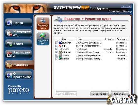 XoftSpySE Anti-Spyware одна из лучших для обнаружения и удаления шпионских и рекламных модулей. Программа XoftSpySE, которая сканирует оперативную память и разделы системного реестра, файлы и папки на предмет присутствия вредоносных программ, таких как: Adware, Spyware, W32/Spybot, Malware, Pop-up Generators, Keyloggers, Unwanted Toolbars, CWS, Trojans, Browser Hijackers, Backdoors, BHOs и др. В настройках сканирования можно указать, какой тип шпионского программного обеспечения необходимо искать на компьютере, а также ограничить поиск указанными папками.