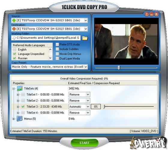 1Click DVD Copy - простой и быстрый инструмент для копирования видео DVD. Подойдёт как начинающим пользователям, (так как очень прост), так и продвинутым... Важно не то, что она обладает простым, но эргономичным интерфейсом и быстро работает, а то, что именно эта программа выдает наилучшее качество изображения при копировании среди себе подобных. Даже при 40% сжатии копия практически неотличима от оригинала.