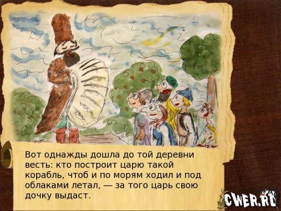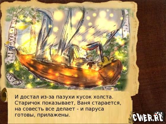 Интерактивная сказка "Летучий корабль" создана по мотивом русской народной и украинской народной одноименных сказок. Ход истории и ее конец зависит от выбора ответов. Возможны как плохие так и хорошие окончания.