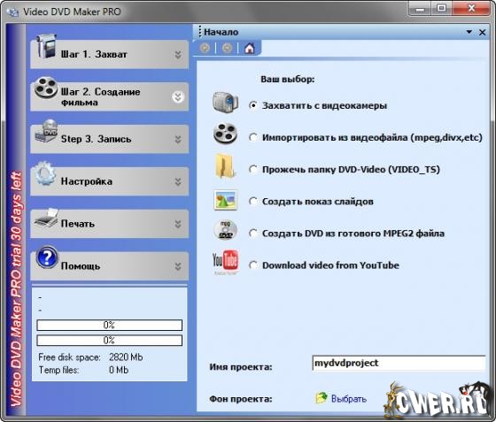 Video DVD Maker может создавать DVD на основе видеофайлов в форматах AVI, DIVX, XVID, MP4, MPG, WMV, ASF, MOV, а также выполнять захват видео с ТВ-тюнера, веб-камеры, DV-камеры и других устройств. Работа программы организована в виде пошагового мастера, и процесс создания диска разбит на три этапа: захват видео, добавление дополнительных файлов, запись DVD. Программа поддерживает запись на любые типы дисков, в том числе двухслойные DVD. Русский интерфейс присутствует.