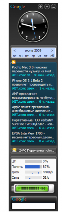 В 4 версии программы появились так называемые гаджеты — плавающие окошки, например индикатор зарядки батарей компьютера или часы.