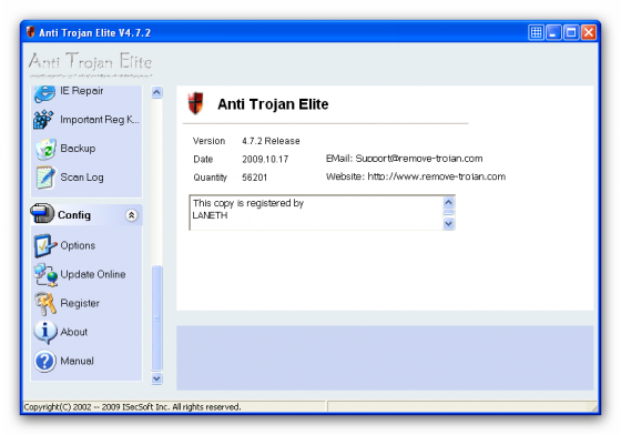 Anti Trojan Elite - программа для очистки компьютера от троянов, кейлогеров и пр. Anti Trojan Elite сканирует не только жесткий диск (включая архивы ZIP CAB), но и смотрит на то, какие процессы запущены. Также она располагает менеджером сетевых процессов, при помощи которого можно определить, где запущен нежелательный процесс. Кроме этого, вы можете просмотреть ключи и значения реестра и удалить подозрительные, починить Internet Explorer, оптимизировать работу Windows вообще. Программа имеет опцию отката.