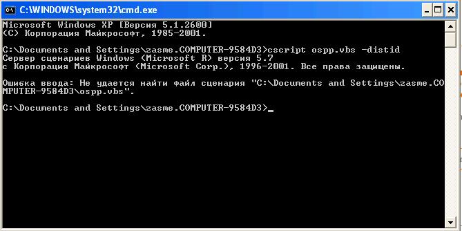 - ВАЖНО: если выдаст ошибку типа команда не распознана или там файл скрипта не найден, просто копируем файлик OSPP.VBS из C:\Program Files\Microsoft Office\Office14 туда, откуда у вас запускается командная строка (у меня это каталог C:\Users\Administrator) и вводим команду по-новой. В результате вы получите Installation ID для оффлайн-активации