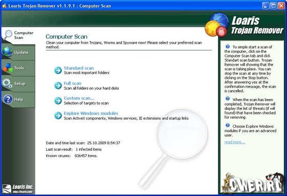 Loaris Trojan Remover также удаляет дополнительные системные обновления, которые были загружены вредоносным программным обеспечением. Программа сканирует все файлы, загруженные во время старта системы, на наличие Adware, Spyware, троянов, интернет червей и др. Доступны два типа сканирования: стандартное сканирование (быстро просматривает систему без потребности в дальнейшей конфигурации параметров сканирования) и пользовательское сканирование (позволит выбрать любую из папок для сканирования).