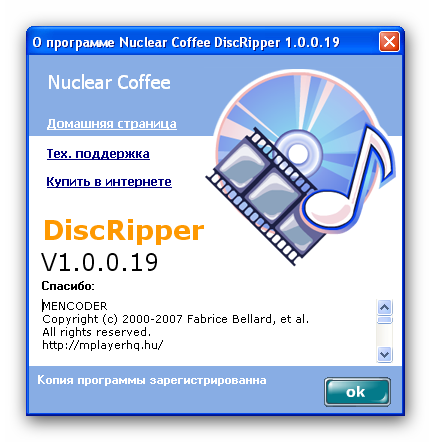 Nuclear Coffee DiscRipper - рипер-конвертор двойного назначения, - для кино и музыки. Позволяет снимать видео и аудио информацию с audio CD и DVD video дисков и конвертировать их в удобочитаемые компактные и мобильные форматы: видео DVD с двойным проходом в AVI, MPEG1, MPEG2, MPEG4, DIVX, XVID, H.264, WMV, 3GP, 3G2; аудио CD в MP3, OGG, WAV, APE. Это позволяет легко просматривать, прослушивать и передавать материал не только на бытовых проигрывателях, но и на мобильных устройствах, например таких как iPod, iPhone, PSP, Creative Zen и прочих. Имеет гибкую систему установки необходимых выходных параметров.