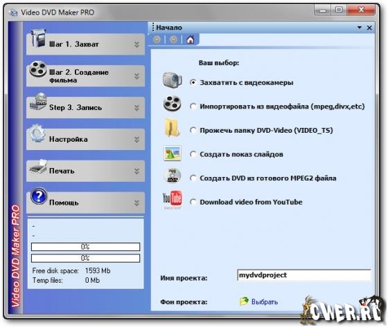 Video DVD Maker может создавать DVD на основе видеофайлов в форматах AVI, DIVX, XVID, MP4, MPG, WMV, ASF, MOV, а также выполнять захват видео с ТВ-тюнера, веб-камеры, DV-камеры и других устройств. Работа программы организована в виде пошагового мастера, и процесс создания диска разбит на три этапа: захват видео, добавление дополнительных файлов, запись DVD. Программа поддерживает запись на любые типы дисков, в том числе двухслойные DVD. Русский интерфейс присутствует.