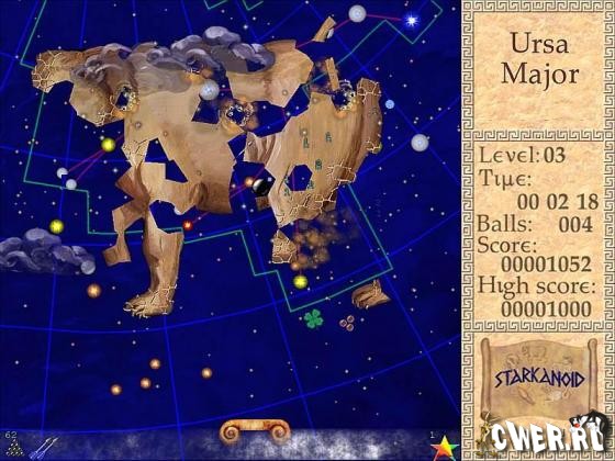 Абсолютно новый подход к жанру арканоид. Эта игра не предложит вам традиционных блоков и кубиков. Вместо них вам предстоит разбивать скульптуры созвездий, чтобы увидеть за ними звезды их образующие. В этой игре вас ждет графика, рисованная вручную, а также приятные мелодии в древнегреческом стиле. Вам предоставляется уникальная возможность увидеть созвездия с точки зрения современной науки и античности. В игре более 20 уникальных уровней и 14 бонусов-усилений.