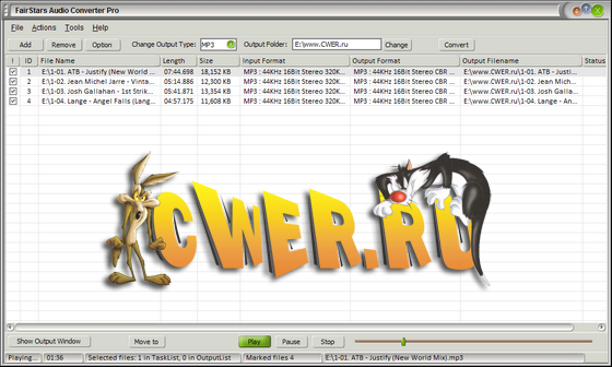 FairStars Audio Converter Pro - профессиональный инструмент для конвертации аудио файлов самых разнообразных форматов (WAV, RealMedia (RM, RA, RMVB, RMJ), AIFF, AU, Creative VOC, PVF, PAF, Amiga IFF/SVX, APE, FLAC, OGG, VQF, MP1, MP2, MP3, WMA, WMV, ASF, MP4, M4A, M4B, AAC to WMA, MP3, AAC, VQF, OGG, FLAC, APE, WAV). Кроме этого утилита позволяет нормализовать композиции по звучанию, улучшить качество воспроизведения, имеет встроенный плеер и позволяет редактировать ID3 теги.