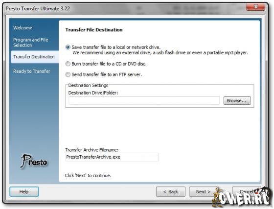 Presto Transfer Ultimate - приложение для автоматизации передачи ваших данных с одного компьютера на другой. Удобный в использовании интерфейс программы создает самораспаковывающийся архив ваших данных, для восстановления которых нужно просто запустить архив на компьютере получателя. Архив можно автоматически записать на CD/DVD, на MP3-плеер через USB, на съемные носители или переслать на удаленный FTP сервер. Вы можете выбрать вручную папки, диски или файлы для копирования или же быстро выбрать и передать данные из множества программ, включая такие программы, как Word, Access, Excel, Photoshop, PowerPoint, Opera, Firefox, Internet Explorer, Outlook, Skype и другие. Интерфейс программы выполнен в виде пошагового Мастера.