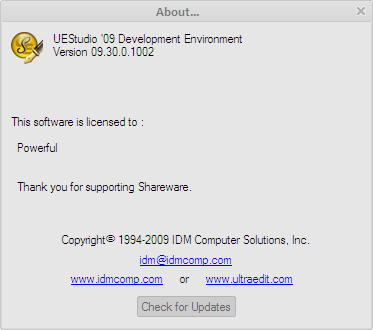 UEStudio - мощная интегрированная среда разработки, построенная на знаменитом текстовом редакторе UltraEdit. UEStudio включает все особенности программы UltraEdit, плюс поддержку для более 30 популярных компиляторов (включая Microsoft Visual C++, Java, GNU C/C++, PHP, Perl и т.д.), интегрированный отладчик, интегрированный VCS элемент управления, встроенный просмотр классов, языковые сведения, конвертер проектов, и многие другие особенности. Имеется огромное количество дополнительных функций и настроек. В девятой версии программы появилось множество улучшений в интерфейсе, появился встроенный отладчик PHP кода, улучшена поддержка FTP и многое другое.