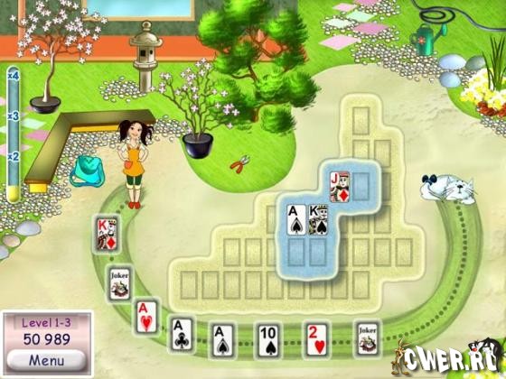В этой новой карточной игре Вы сможете построить свой великолепный японский сад. Берите карты, двигающиеся на конвейере, и кладите их на игровое поле рядом с картами, которые на ранг ниже или выше. Заполните все пустые ячейки и наблюдайте за тем, как на Ваших глазах расцветает сад.