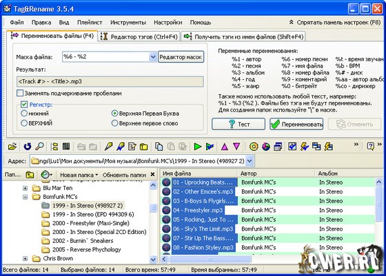Tag&Rename - программа, предназначенная для ручного управления музыкальными файлами. С помощью данной утилиты Вы сможете быстро и легко переименовать вашу музыкальную коллекцию, используя встроенную информацию в тегах, создавать новые или редактировать существующие теги, а также создавать теги, основанные на именах файлов...