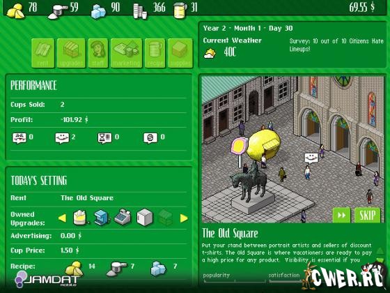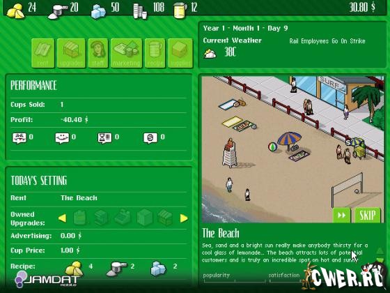 Проверьте свое мастерство предпринимателя: сможете ли вы развить маленький торговый лоток в целую бизнес-империю? Выберите подходящее место для розничной торговли прохладительными напитками, изобретите лучший рецепт лимонада и установите цену, а также не забудьте просмотреть последний прогноз погоды. Например, если жарит солнце, а в городе проводятся соревнования по сёрфингу, то самое время катить тележку на пляж, где соберётся куча умирающего от жажды народа. Если же с утра зарядил мерзкий противный дождик, то можно поискать счастья возле супермаркета или в центре города, на пляже точно ничего не заработаете.