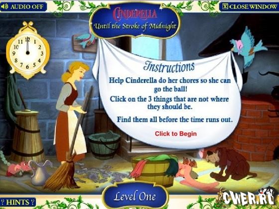 Помогите Золушке попасть на бал до истечения времени. В игре 3 уровня, в которых необходимо отыскать предметы.