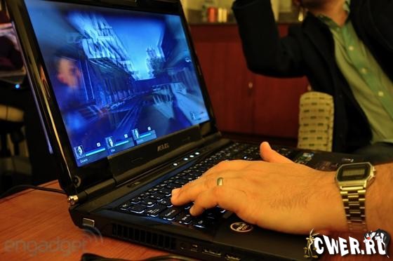 Достаточно надеть специальные очки и подключить к ноутбуку инфракрасный передатчик, и можно погрузиться в реалистичный виртуальный мир с четким, ярким и «глубоким» изображением. Видеокарта при этом строит трехмерную сцену отдельно для каждого глаза, а ЖК-дисплей со 120-гигагерцовой частотой обновления показывает кадры каждой сцены поочередно, синхронизируя их с открыванием и закрыванием линз специальных очков. Таким образом, каждый глаз видит свою отдельную картину, а вместе это дает настоящее трехмерное изображение. Технология 3D Vision в настоящее время работает в более чем 400 компьютерных играх, включая такие популярные новинки, как Resident Evil 5, Borderlands, World of Warcraft: Wrath of the Lich King, Batman: Arkham Asylum и Star Trek D-A-C.