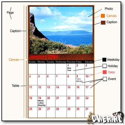- Built in wizard, lets you define the look of your calendar, or choose from predefined theme
