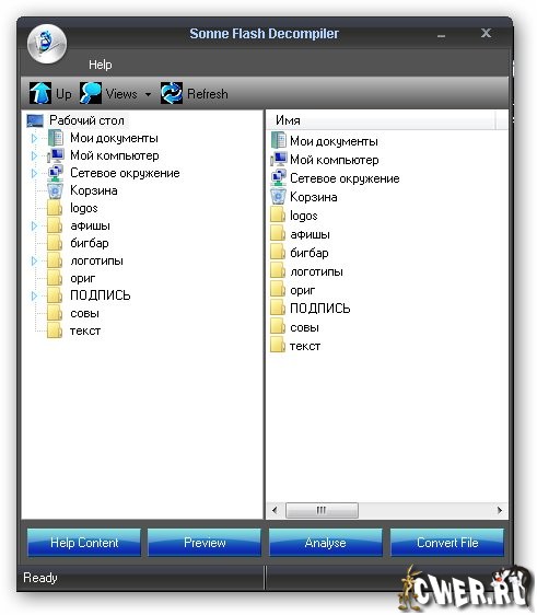 Интерфейс программы разделен на два окна, программа имеет встроенный проигрыватель флеш - файлов. В первом окне вы должны выбрать папку, в которой находятся флеш - ролики, во втором окне вы должны выбрать нужный ролик, который вы сможете как проиграть во флеш -проигрывателе, так и проанализировать, отредактировать его элементы, после чего экспортировать все объекты по отдельности в указанную папку.