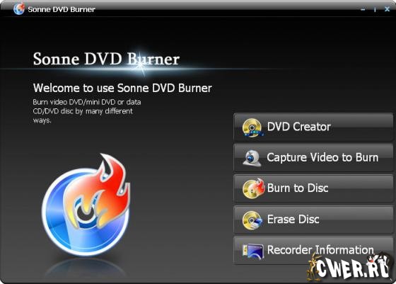 Sonne DVD Burner является мощной программой для записи DVD и предназначена для удовлетворения всех ваших потребностей в записи видео, файл образа ISO и VIDEO_TS с DVD диска и запись всех файлов на диск с данными, создание DVD из других видео файлов. Программа может захватывать видео для записи на DVD. Добавлена новая функция захвата для удовлетворения пользователей. Пользователи могут легко захватить видео или изображение из другого устройства, DV и ТВ-тюнера. Может записывать Audio CD из файлов MP3, создавать меню диска.