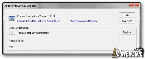 Product Key Explorer - позволяет расшифровать и увидеть, а также сохранить серийные номера (Product ID, Product Key, License Info, User Name, Company) продуктов Microsoft, CD-key установленных на компьютере программ, и не только их. Неполный список ПО, регистрационные данные которых можно увидеть и сохранить: Micrsoft Windows (2000, XP, 2003, Vista), Microsoft Office 2003, Microsoft Office 2007, Microsoft Office XP, Micrsoft Visual Studio 2005, Macromedia, Ahead Nero, Adobe Photoshop, CyberLink PowerDVD, Borland Delphi и т.д.