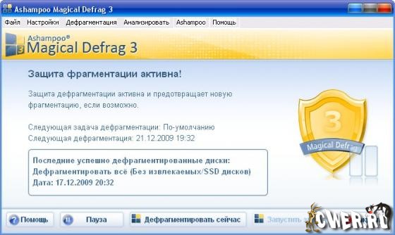 Ashampoo Magical Defrag - программа для дефрагментирования жесткого диска. Утилита работает в фоновом режиме как сервис и по необходимости проводит дефрагментирование диска. Пользователи с необходимыми правами также могут мониторить и контролировать работу программы по сети. Эта программа будет постоянно осуществлять дефрагментацию жесткого диска на вашем компьютере. Причем это не повлияет ни на скорость вашего компьютера, ни на производительность. Ashampoo Magical Defrag 3 использует усовершенствованные технологии, чтобы предотвратить фрагментацию диска. Если вы хотите наблюдать за действиями программы, включите вывод графической информации. В программе имеется совместимость с Windows Vista и многоязычная поддержка, включая интерфейс на русском языке.