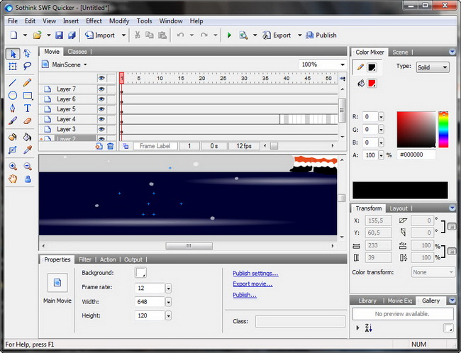 Редактор программы предоставляет возможности для редактирования всех элементов во флэш-видео, например, добавление или изменение текста, замена форм или звуков, назначение ссылок и т.д. К каждому объекту флэш-сцены вы сможете применить встроенные в программу эффекты перехода или появления объекта. Возможно, для вас эта программа сможет стать заменой приложению Adobe Flash, т.к. обладает простым и легким в понимании и использовании интерфейсом.