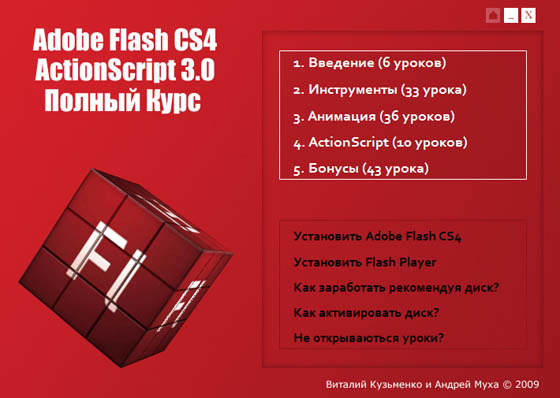 Данный мультимедийный курс содержит всю необходимую информацию и доступные объяснения, которые позволят немедленно приступить к работе с Adobe Flash CS4: начиная от создания интерактивной флеш анимации до обучения новому языку программирования Actionscript 3.0.