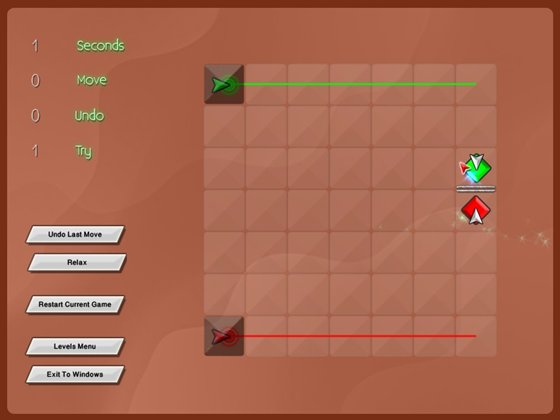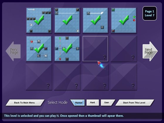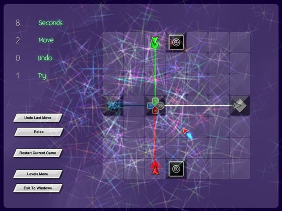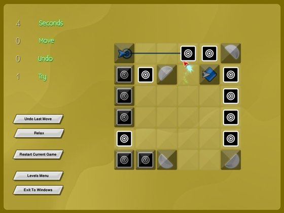 В отличие от многих других подобных игр здесь возможно двигать (толкать) элементы по игровому полю, а некоторые элементы нельзя вращать. Найдите верную комбинацию, при которой все лучи пройдут путь от источника к коллектору правильного цвета.