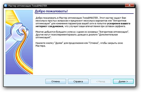 - Connection Optimization Wizard (мастер оптимизации соединения) Этот модуль представляет собой пошаговый мастер, который позволяет настроить Интернет-соединение наилучшим образом. При этом пользователю не нужно устанавливать никакие настройки - необходимо лишь указать тип Интернет-соединения и способ подключения к Интернету, а затем выбрать один из трех вариантов оптимизации (они в программе так и называются - вариант 1, 2 и 3). Если оптимизация не принесла желаемого результата, можно попробовать выбрать другой вариант или же при помощи того же мастера вернуться к исходным настройкам.