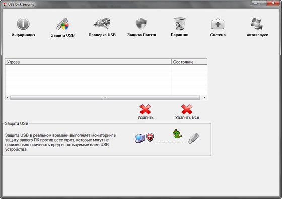USB Disk Security - инновационное программное обеспечение, которое обеспечивает вам 100% защиту от вредоносных программ и вирусов, распространяемых через сменные носители. Программа проста в обращении, не требовательна к системным ресурсам и относится к категории "поставил и забыл". Программа полностью совместима с современными антивирусами, что позволяет Вам обеспечить наибольшую защиту при использовании их вместе.