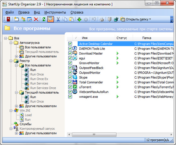 Программа Startup Organizer выводит полный список приложений, запускающихся с помощью стандартных средств автозагрузки Windows, реестра, в качестве служб. С помощью данной программы возможны изменения списков автозагрузки всех пользователей, чьи учётные записи присутствуют в системе (естественно, при условии активной учётной записи администратора).