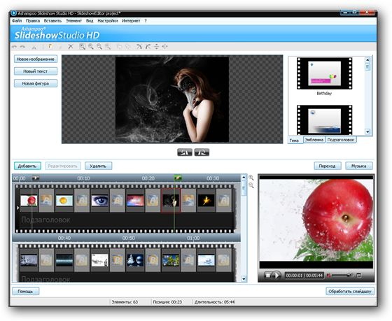 Ashampoo Slideshow Studio - программа, которая упрощает работу с цифровой фотографией. Вы сможете создавать захватывающие слайд-шоу при помощи одного щелчка мыши, добавлять музыку и анимированные переходы. Есть возможность записывать слайд-шоу на DVD носитель, чтобы просмотреть на домашнем DVD плеере. Возможно создавать слайд-шоу в формате HD, а затем загрузить его на YouTube или создать в MPEG2, MPEG4 и WMV форматах.